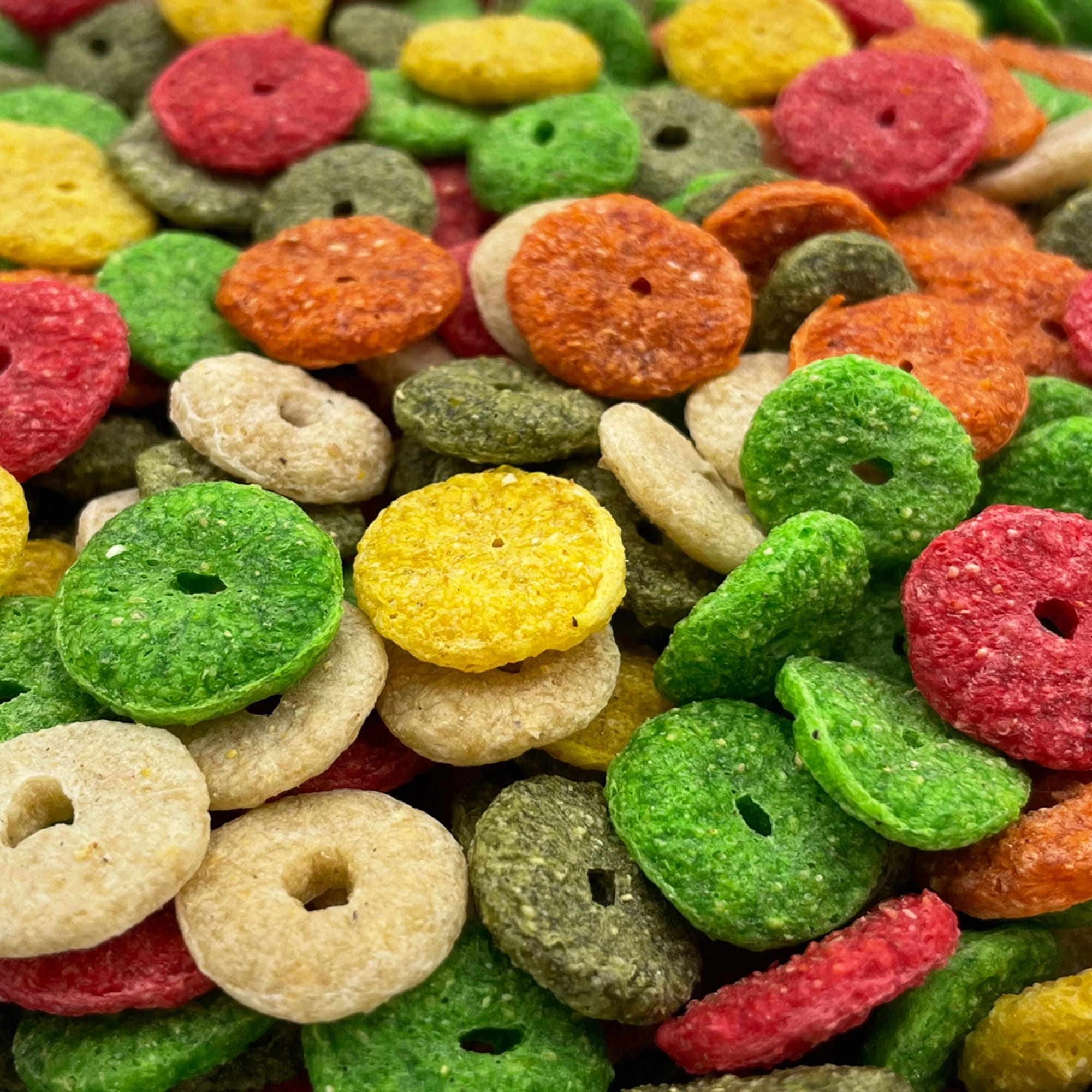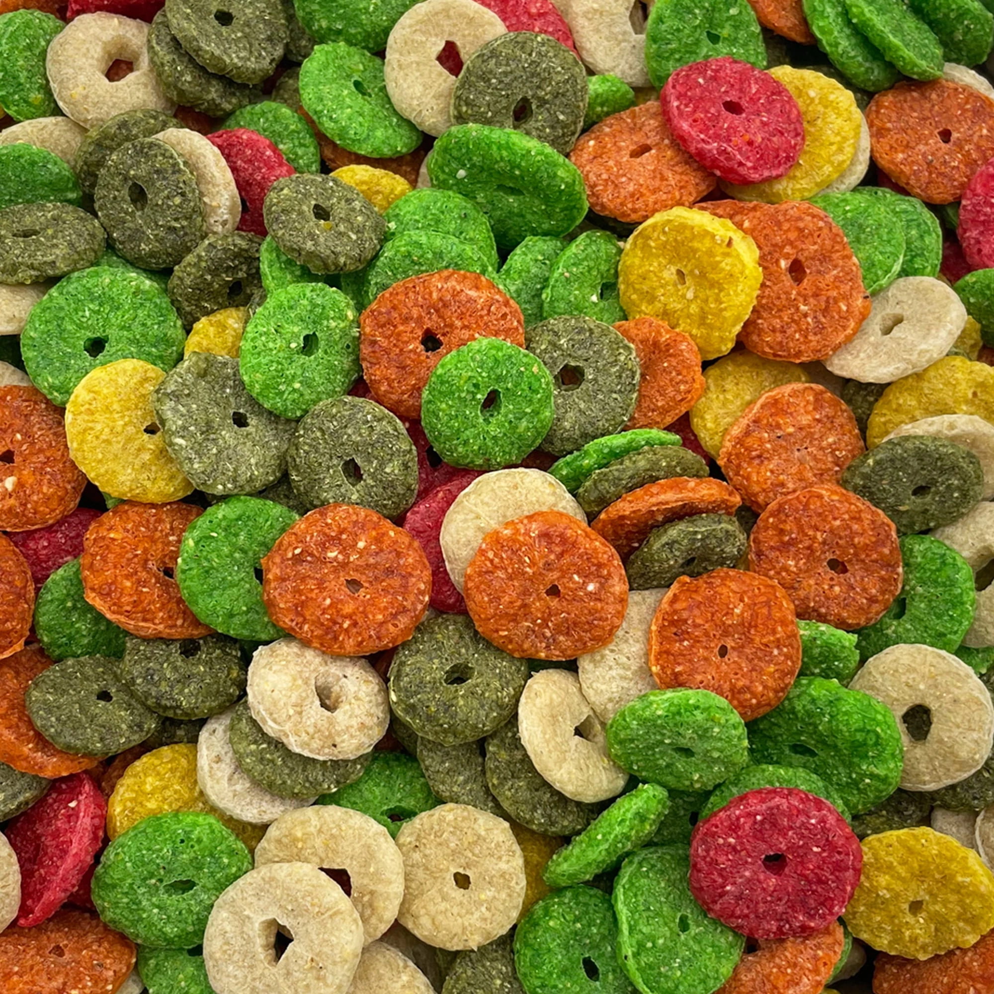 Skład: Śruta kukurydziana, pietruszka suszona, jabłko suszone. Dodatki paszowe: Barwniki: zieleń pistacjowa (E140), czerwień koszenilowa (E124) – stosowane zgodnie z rozporządzeniami (WE) nr 1129/2011 i 232/2012. Skład analityczny: Białko surowe: 7,7% Tłuszcz surowy: 0,94% Popiół surowy: 1,36% Włókno surowe: 2,25% Wilgotność: 9,6%