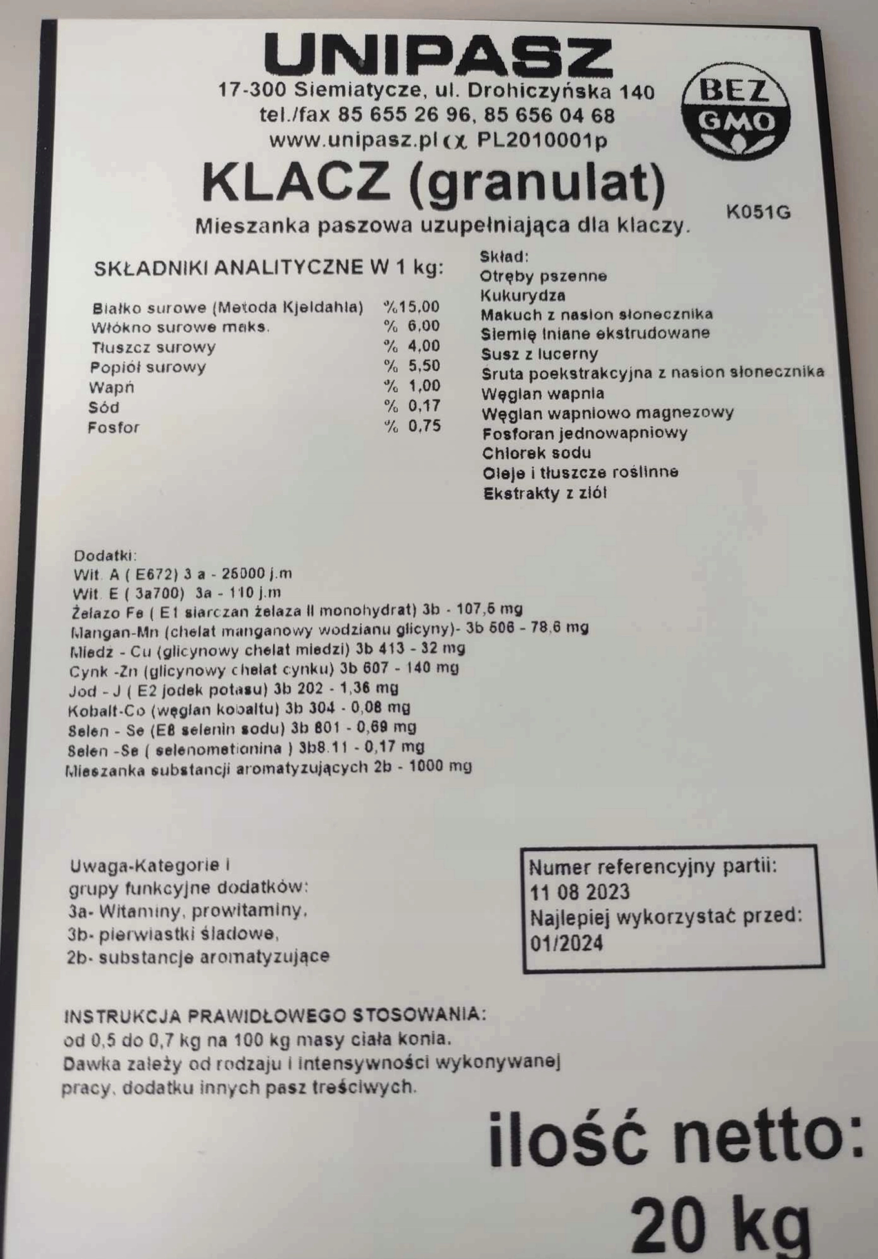 MIESZANKA PASZOWA UZUPEŁNIAJĄCA DLA KLACZY UNIPASZ GRANULAT